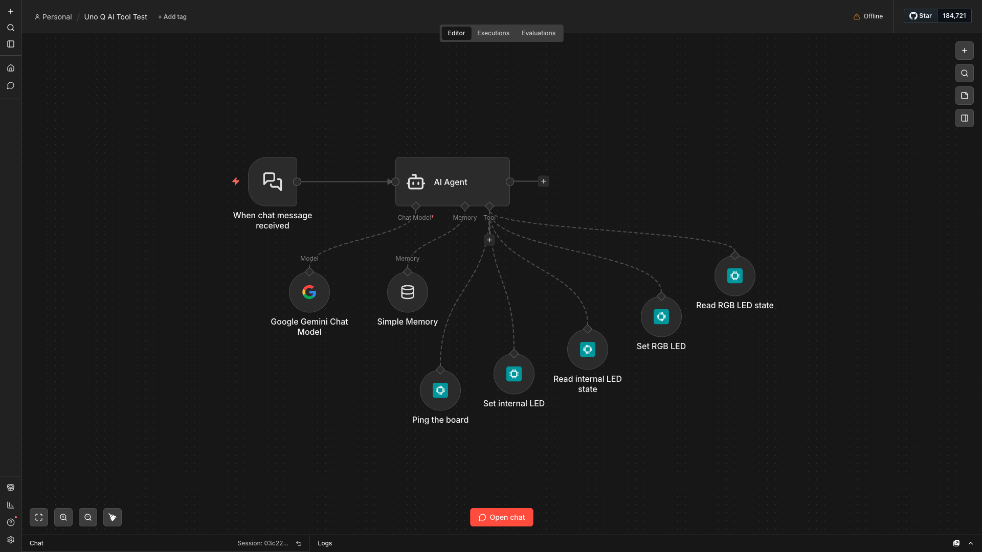 The less obvious question — but the one that made this project actually interesting — is: can an LLM talk to the MCU as a tool? Can you drop a "read temperature" node onto an AI Agent's tool port and let the model decide when to sample it, chain the result with a database lookup, and then decide whether to turn on a fan?